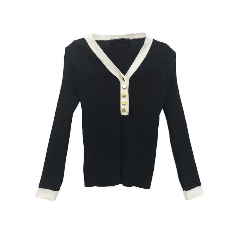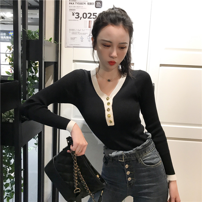 復古韓國chic風修身顯瘦條紋撞色V領長袖打底衫韓版學生針織衫女