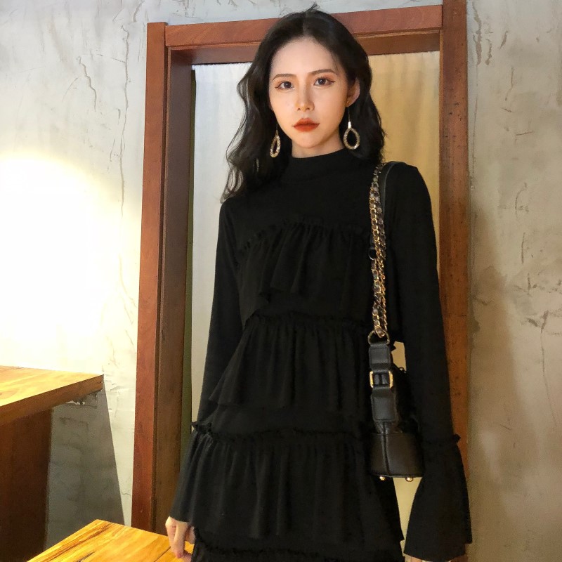 / 秋裝女2018新款百搭半高領喇叭袖高腰顯瘦蛋糕裙修身長袖連衣裙