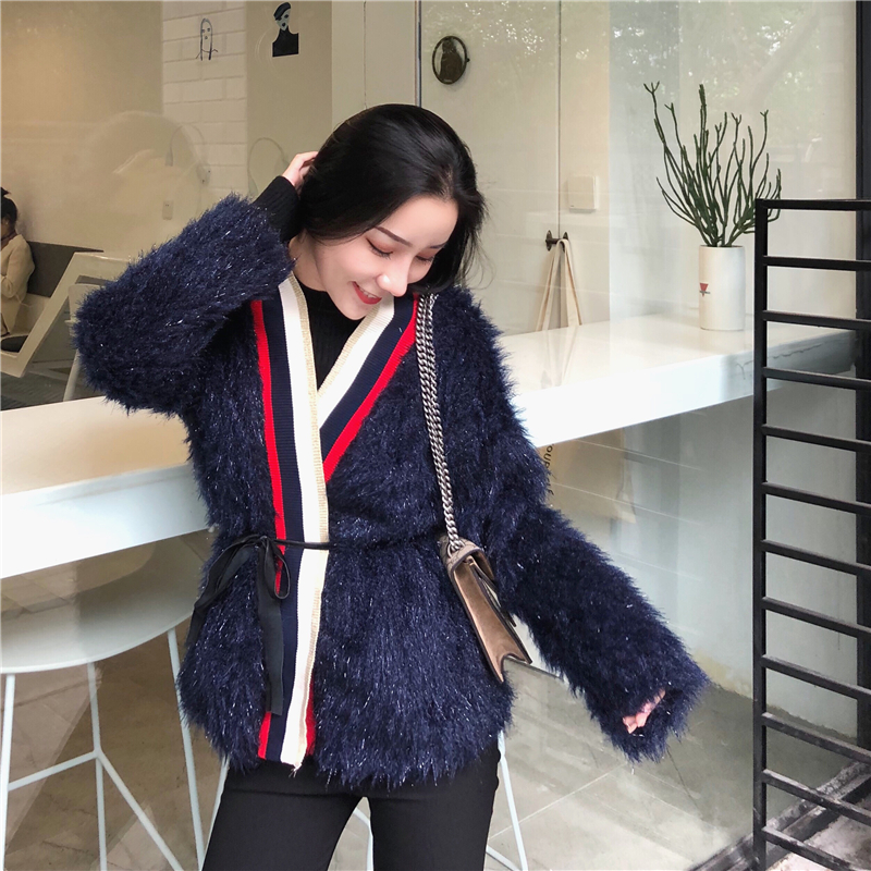/ 韓版chic亮晶晶毛絨新款秋冬時尚百搭寬松顯瘦收腰長袖開衫外套女