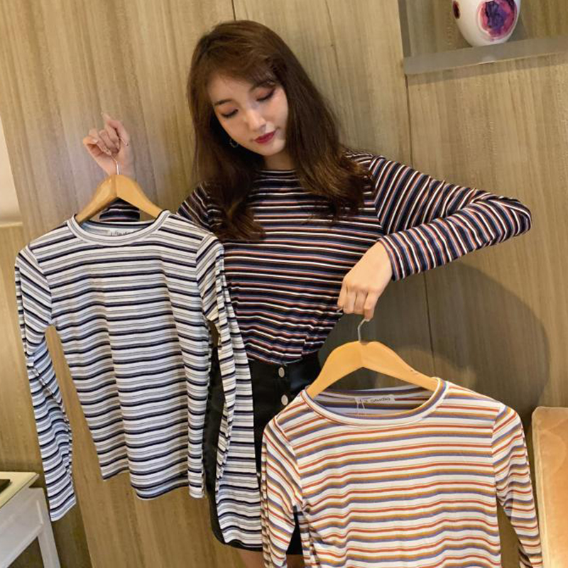 秋裝女2018新款韓版條紋長袖T恤學生修身打底衫百搭圓領體恤上衣