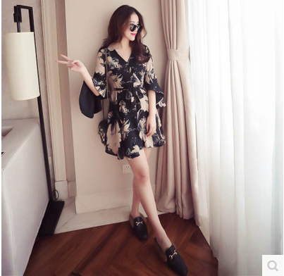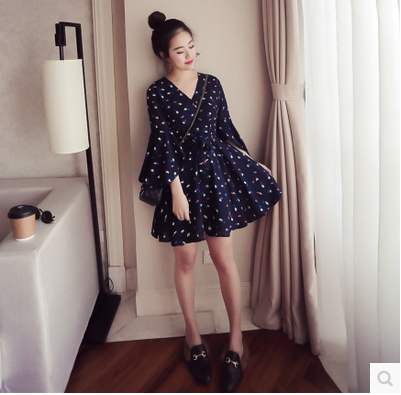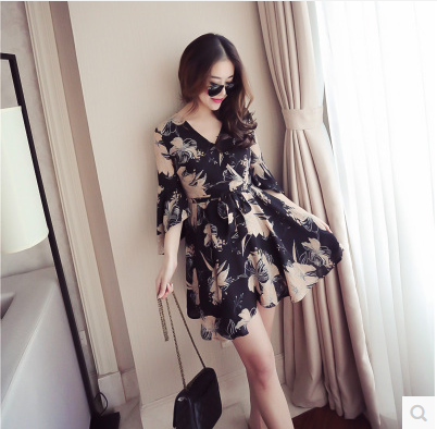 / 春秋季女裝新款韓版時尚收腰系帶喇叭袖V領印花雪紡裙連衣裙