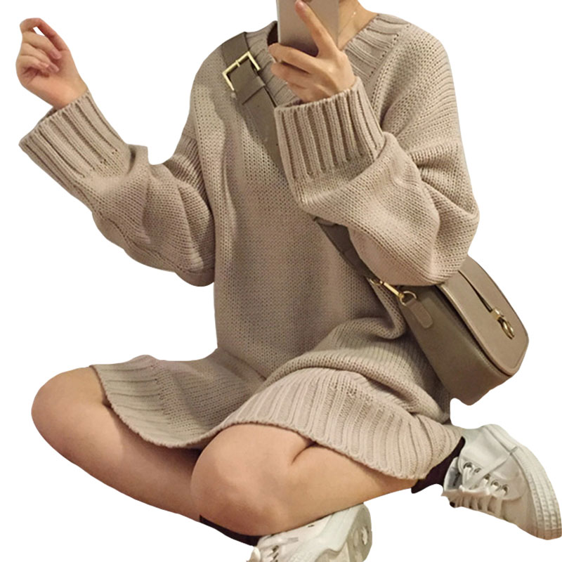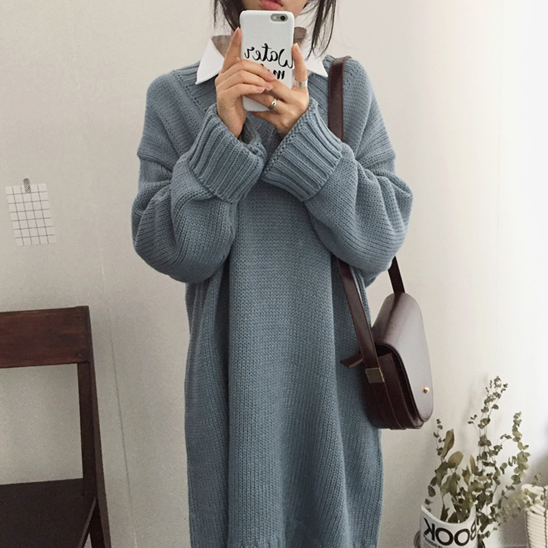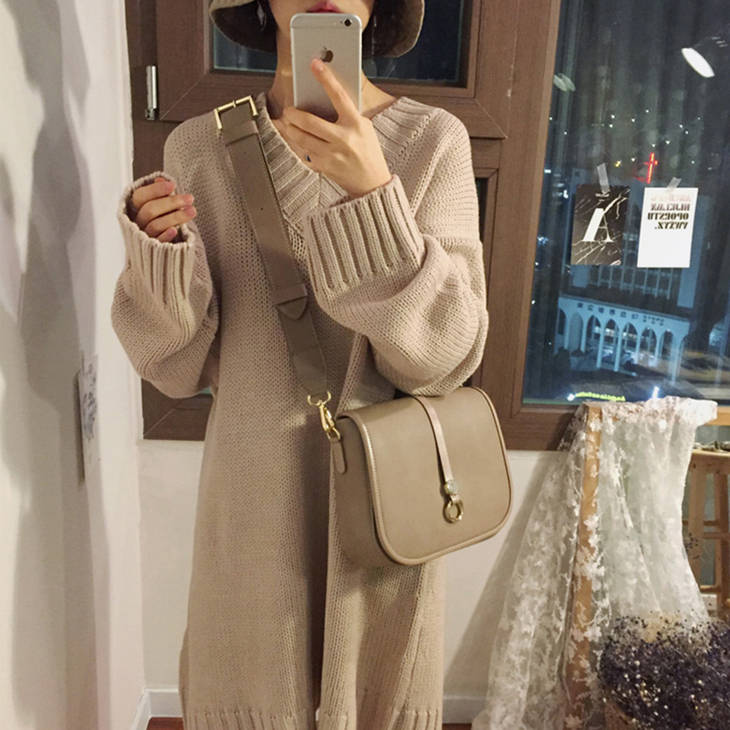 / 秋裝女裝韓版慵懶風寬松V領毛衣中長款長袖針織衫連衣裙上衣外套