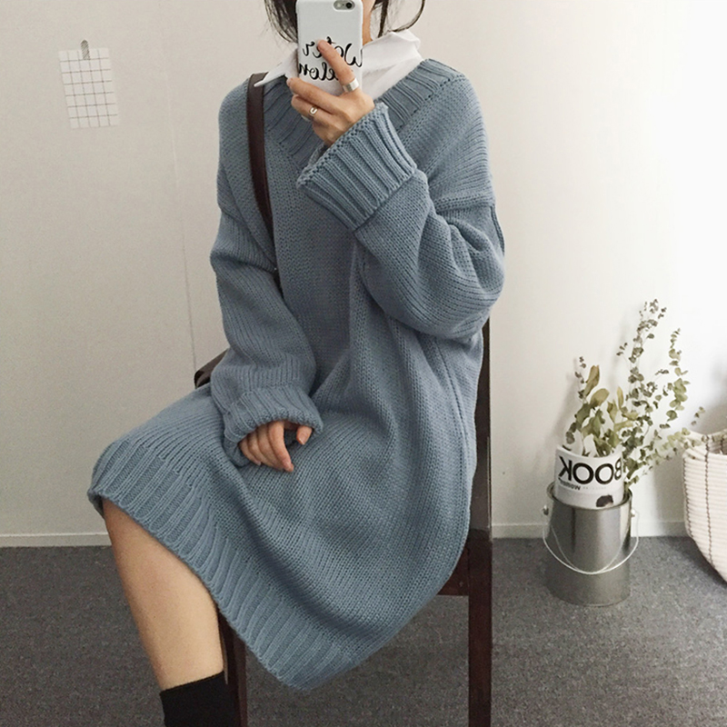 秋裝女裝韓版慵懶風寬松V領毛衣中長款長袖針織衫連衣裙上衣外套