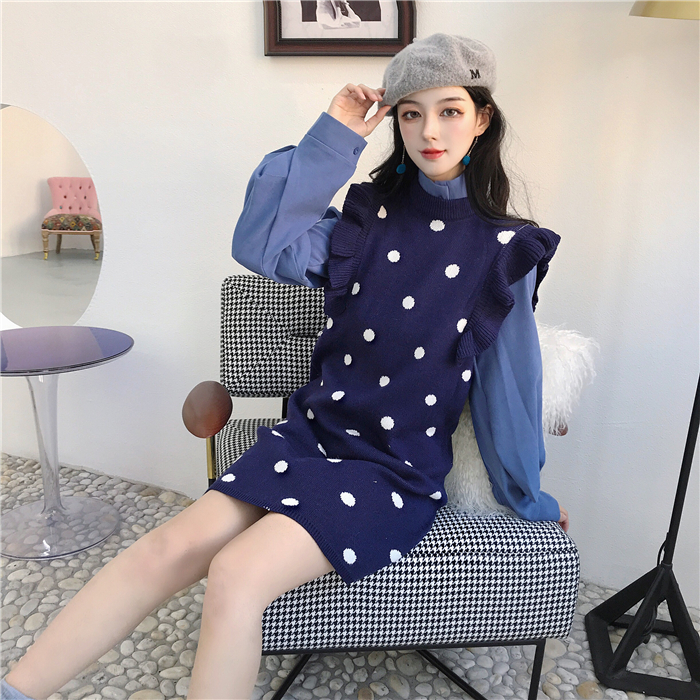 / 套裝女秋冬2018新款寬松立領長袖襯衫木耳邊波點針織背心連衣短裙