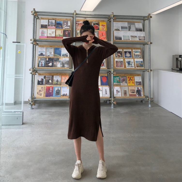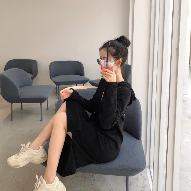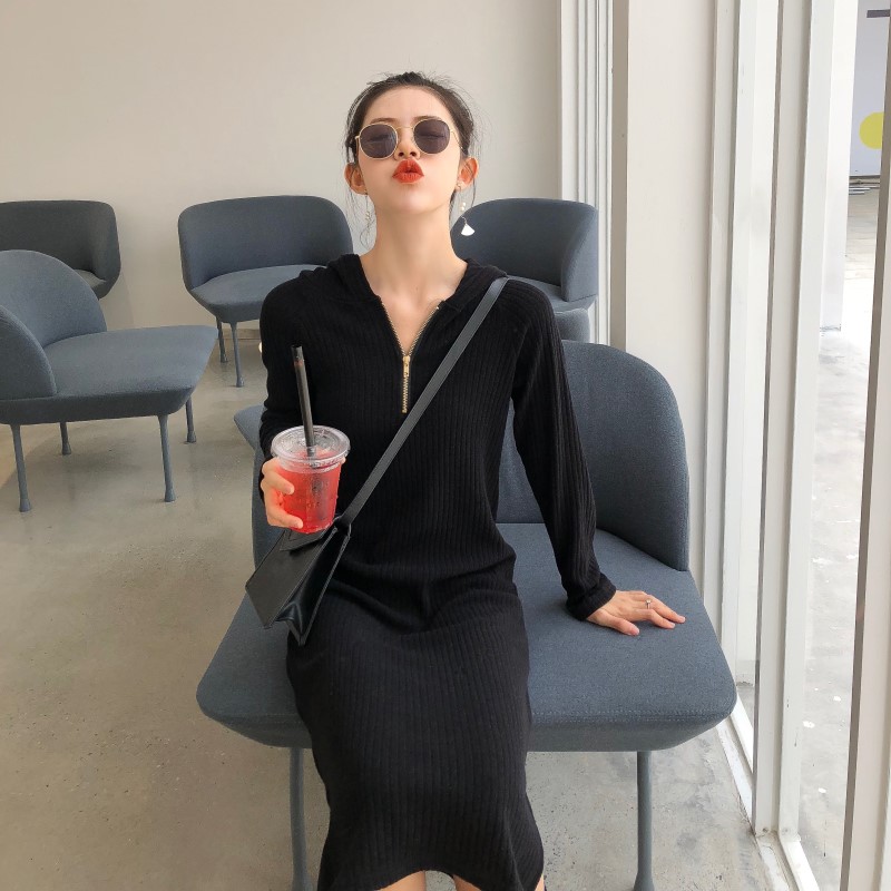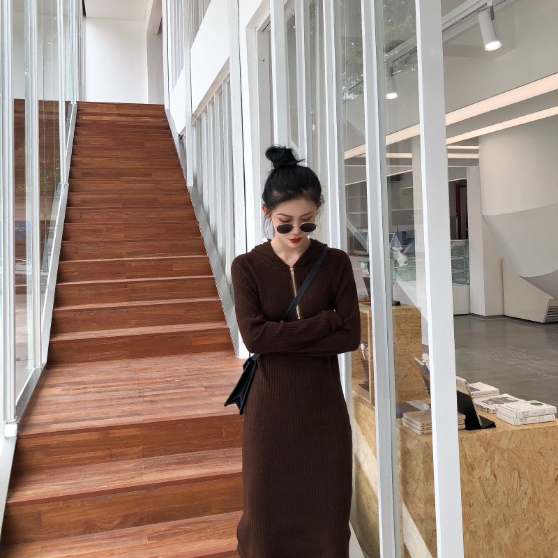 / 百搭寬松顯瘦連帽拉鏈套頭秋裝新款晚晚風中長款過膝開叉連衣裙女