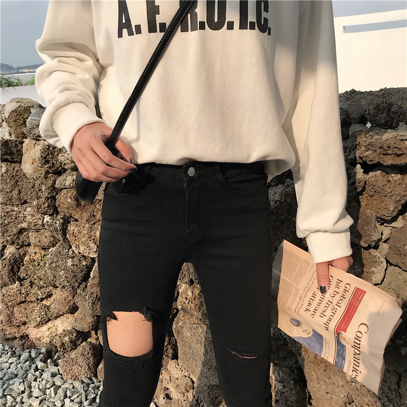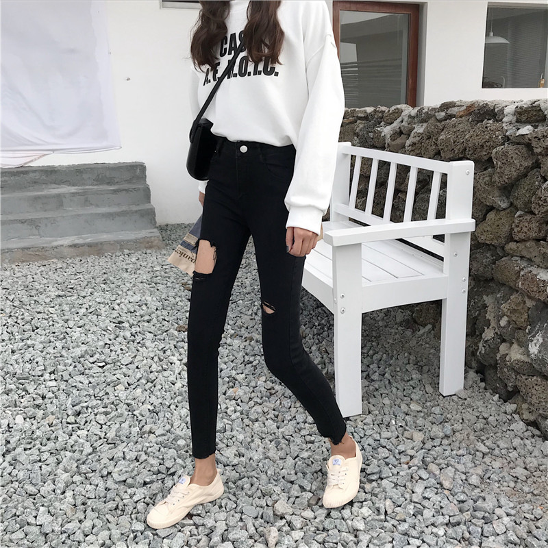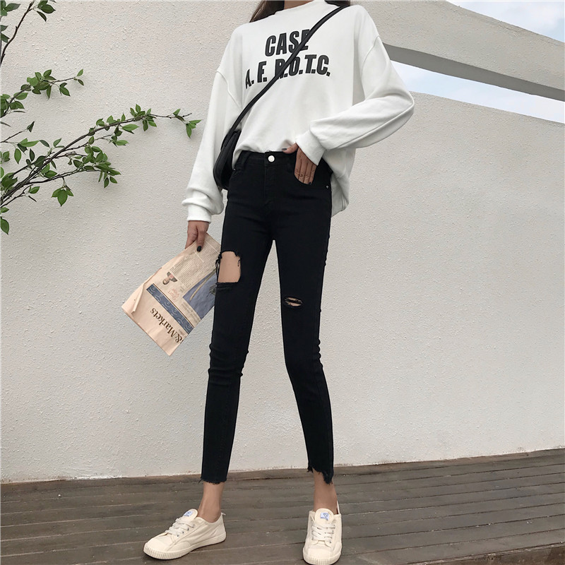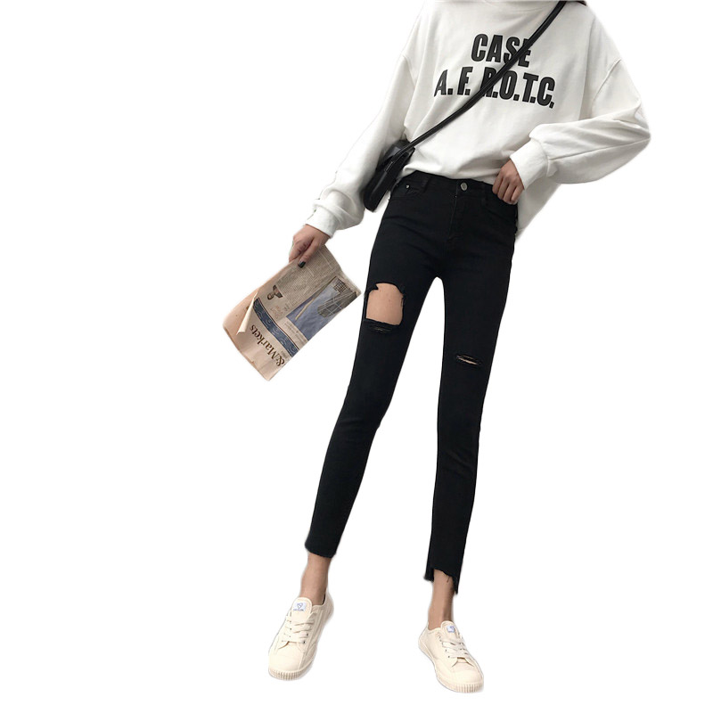 時尚破洞牛仔褲女春秋2018新款韓版顯瘦黑色小腳九分褲修身緊身褲