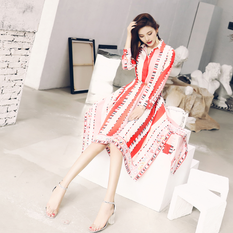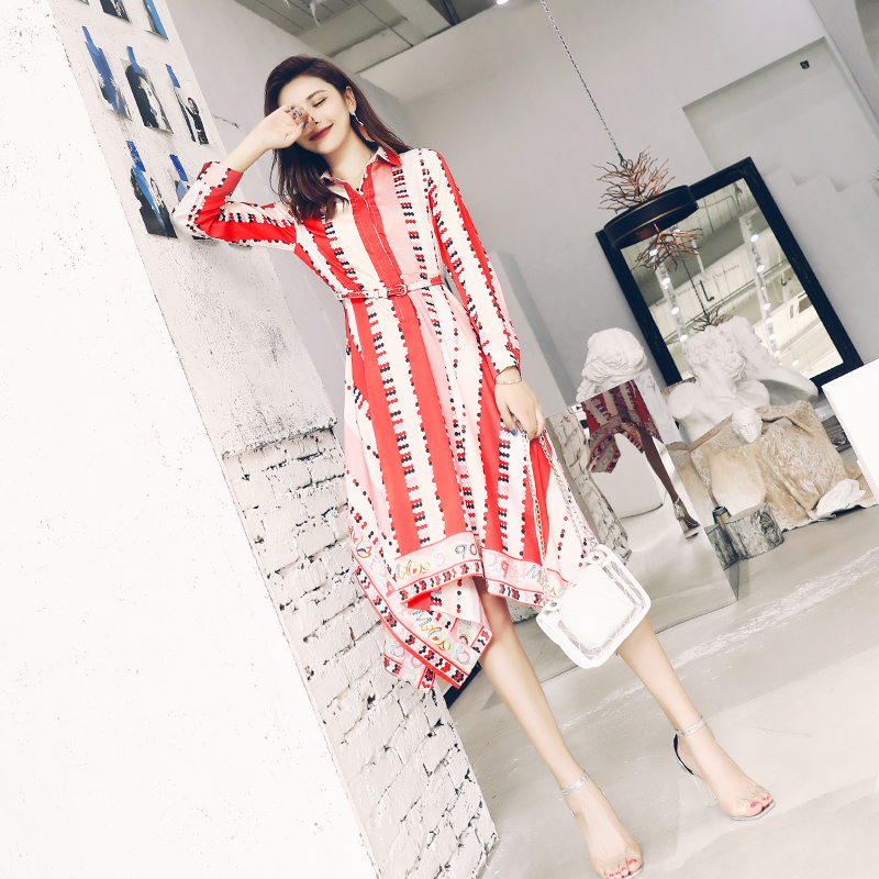 襯衫連衣裙女2018新款韓版印花撞色顯瘦中長款夏季收腰慵懶風裙子