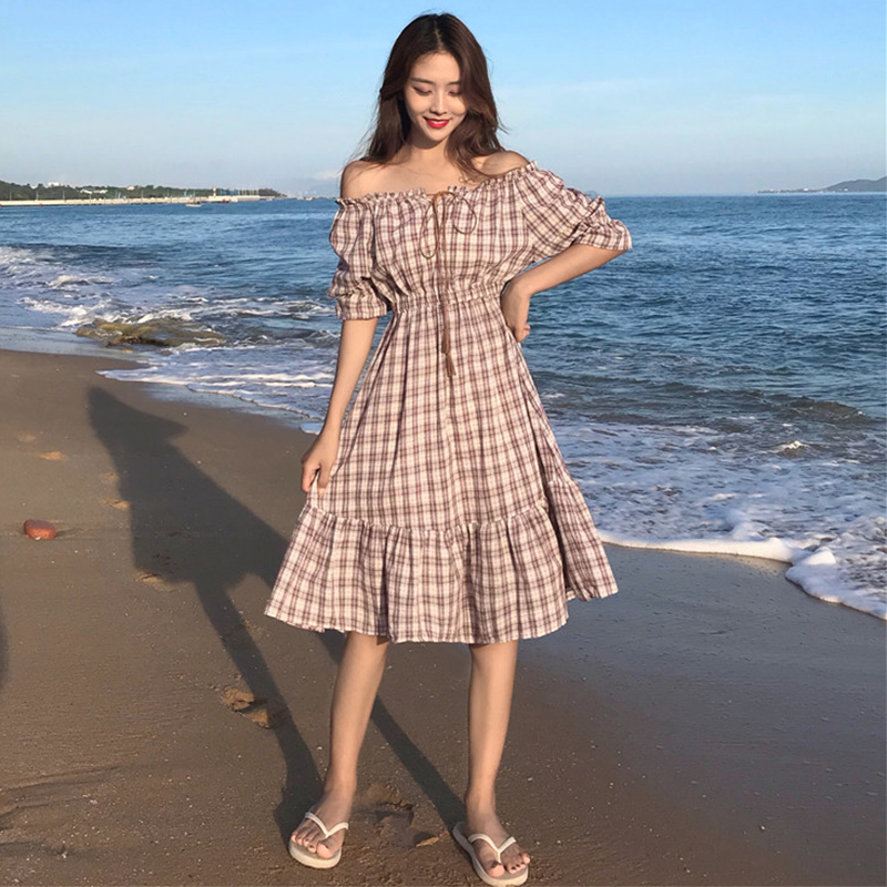 連衣裙女夏新款韓版女裝小清新露肩一字領燈籠袖格子荷葉邊中長裙