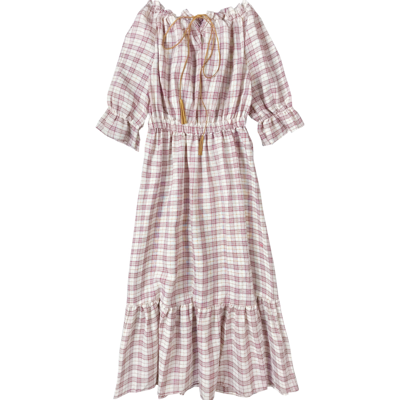 / 連衣裙女夏新款韓版女裝小清新露肩一字領燈籠袖格子荷葉邊中長裙