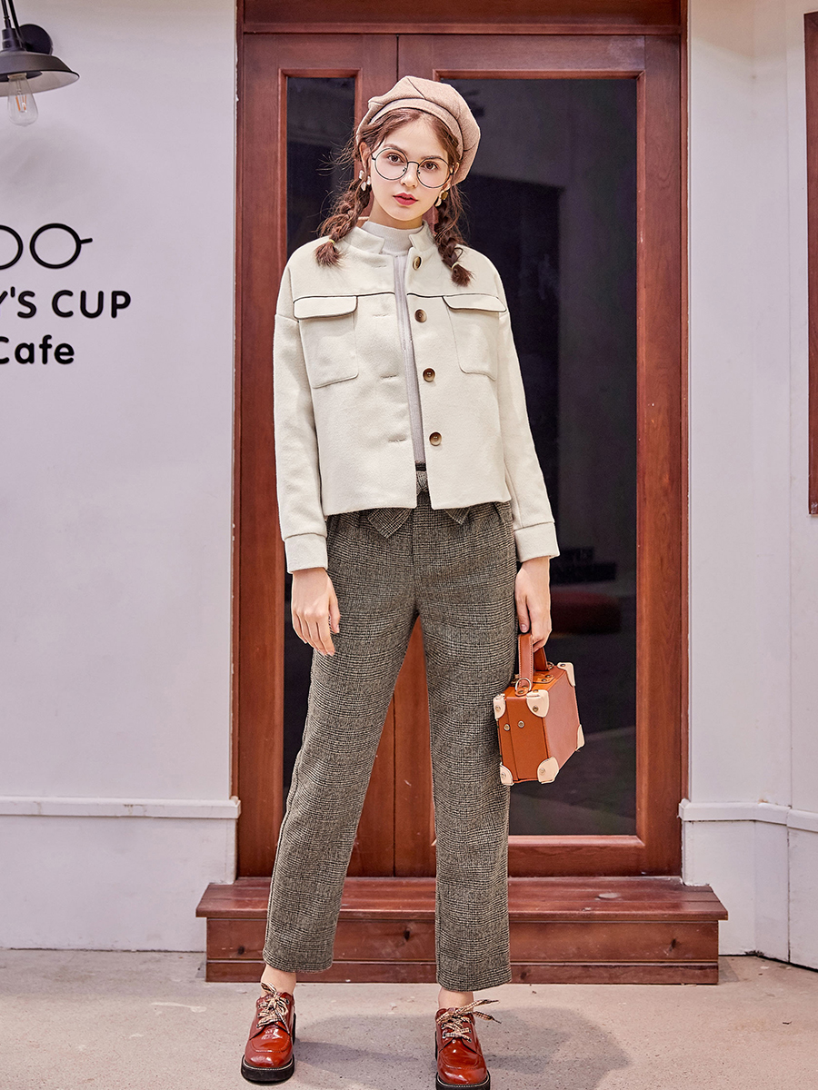 MG小象寬松短外套女冬季2018新款千鳥格休閑直筒褲學生長袖上衣潮
