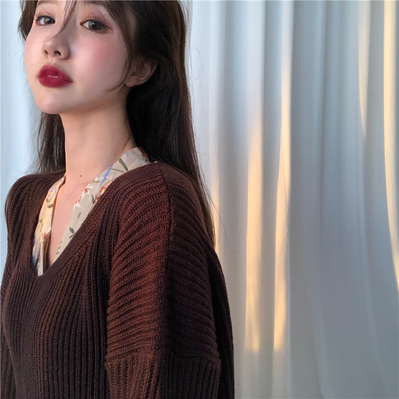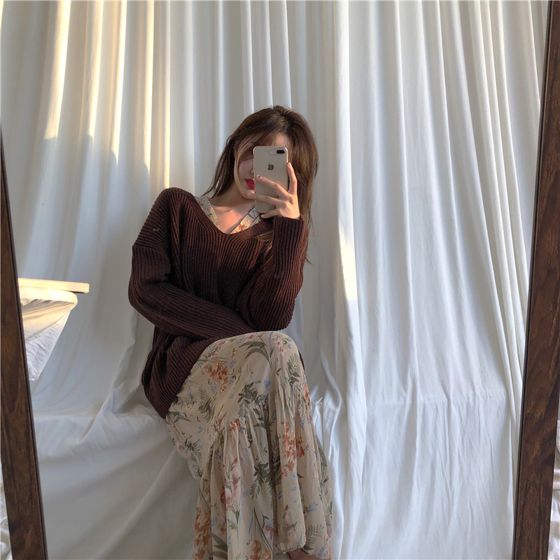 / 2018秋冬新款V領針織棕色系暖毛衣女軟糯上衣+復古碎花收腰連衣裙