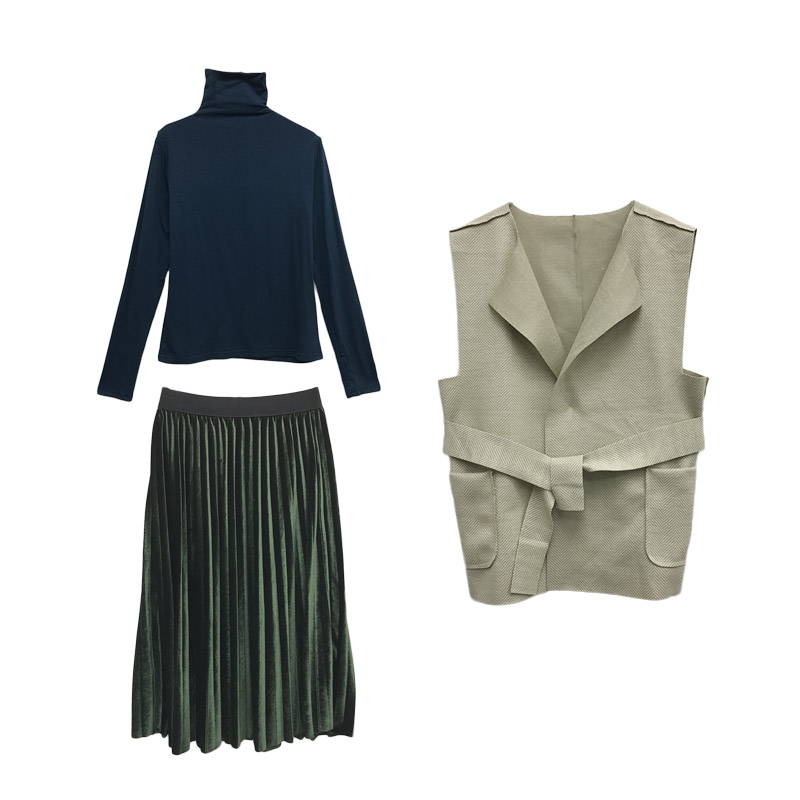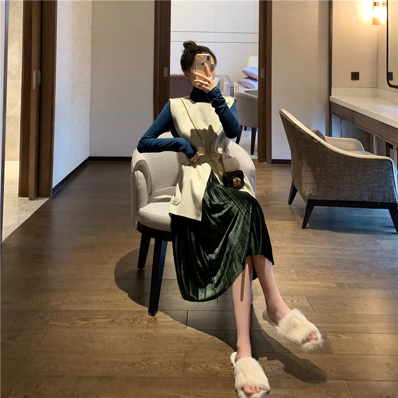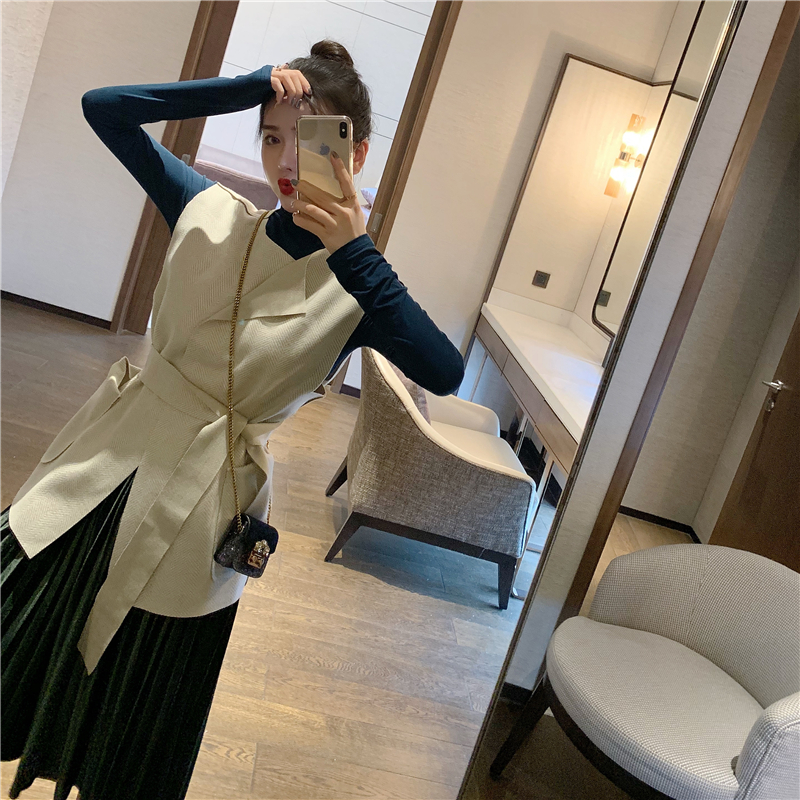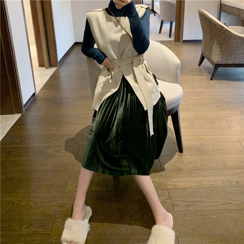 秋季套裝時尚斜紋腰帶馬夾呢外套女+超柔高領打底上衣+高腰百褶裙