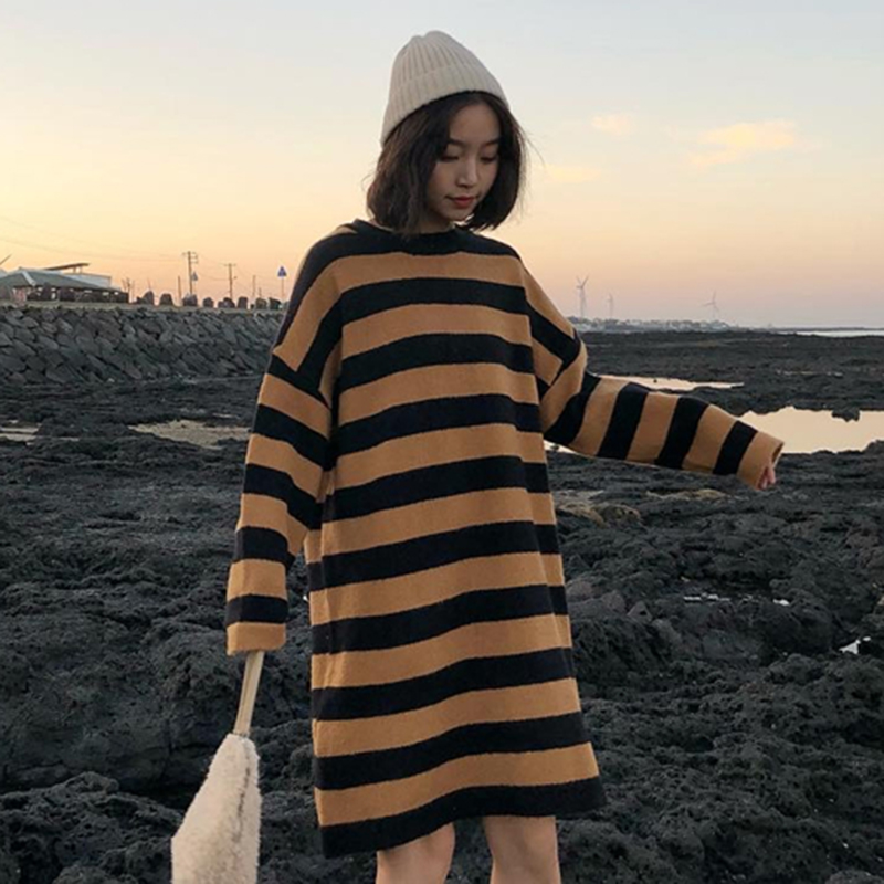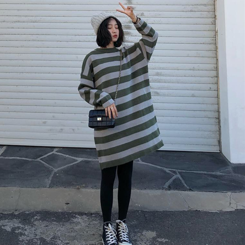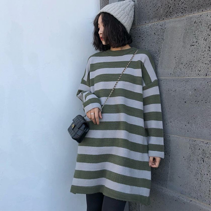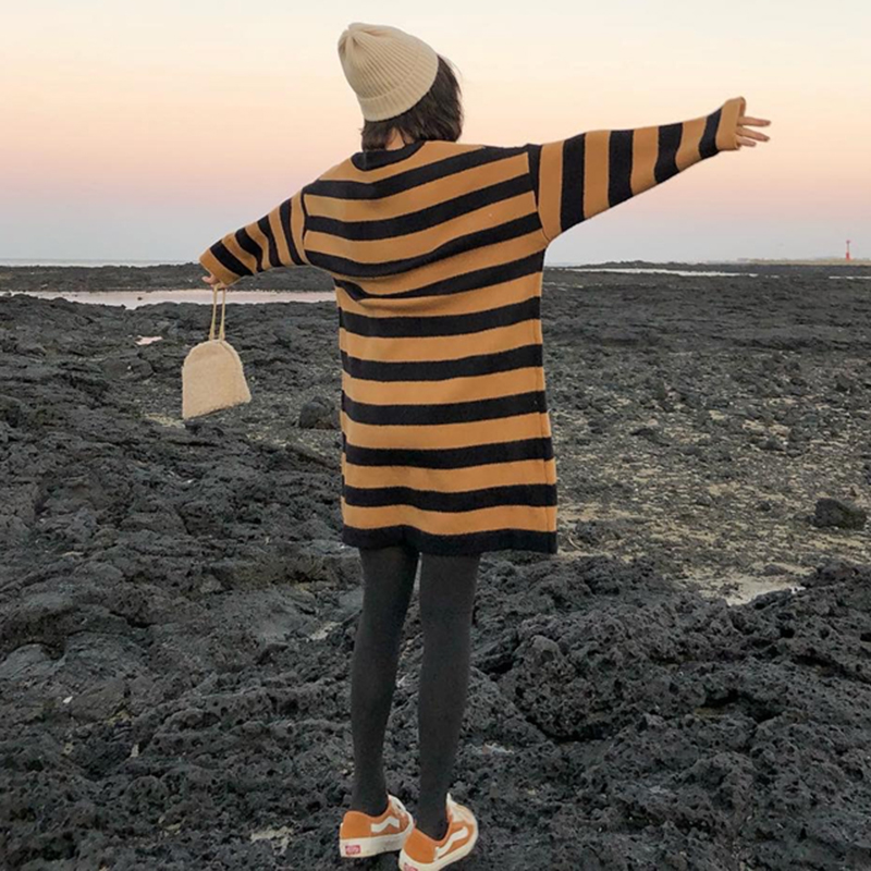 寬松條紋圓領毛衣女秋冬裝2018新款中長款針織外套慵懶風長袖上衣