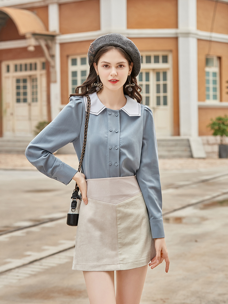 / MG小象小清新藍色襯衫女冬季短款高腰半身裙2018新款寬松學生上衣