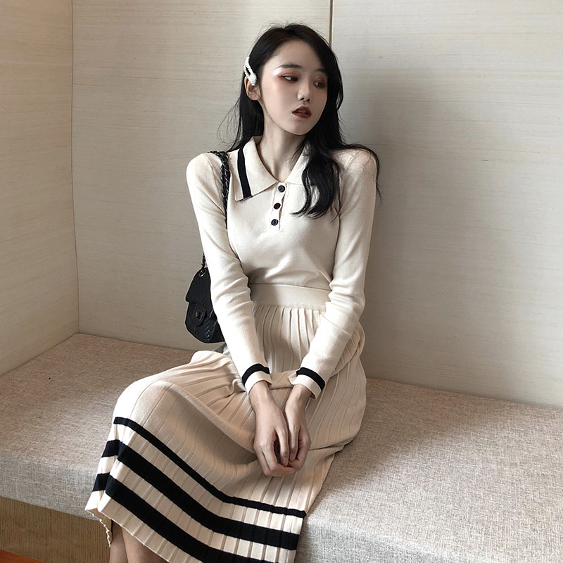 韓版甜美小清新秋裝收腰顯瘦撞色系帶針織上衣+顯瘦高腰A字裙套裝