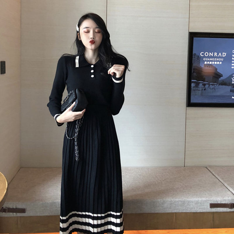 韓版chic早秋毛衣慵懶2018新款女氣質翻領中長款喇叭袖打底連衣裙