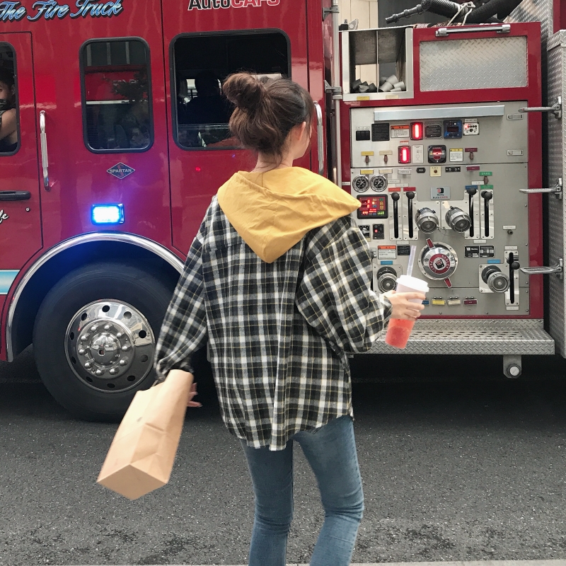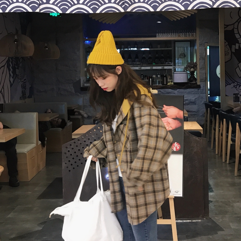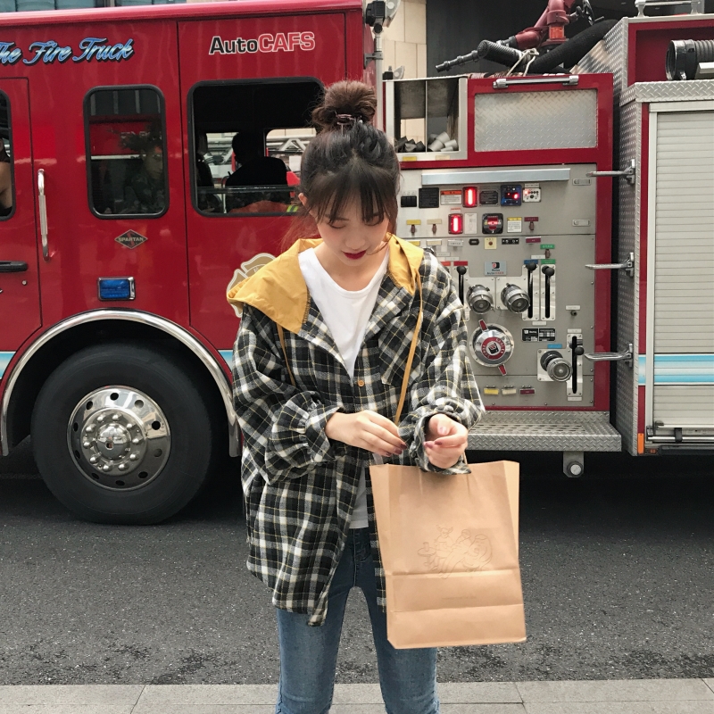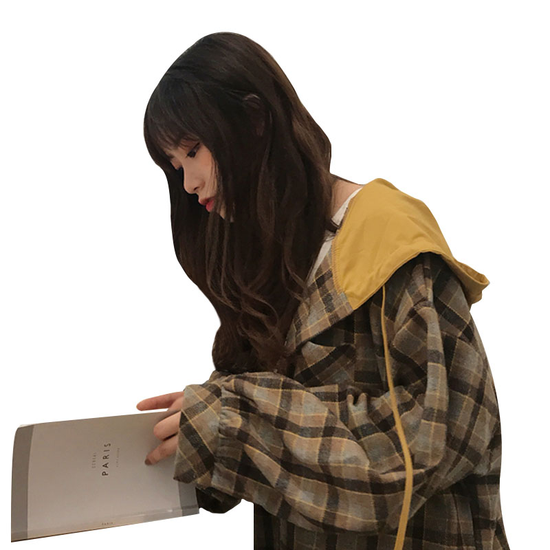 / 秋季韓版中長款復古BF風寬松休閑拼色格子連帽呢料襯衫上衣外套女