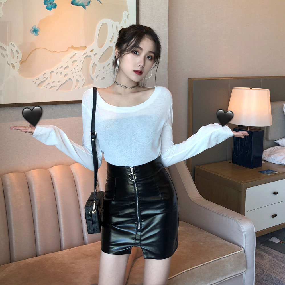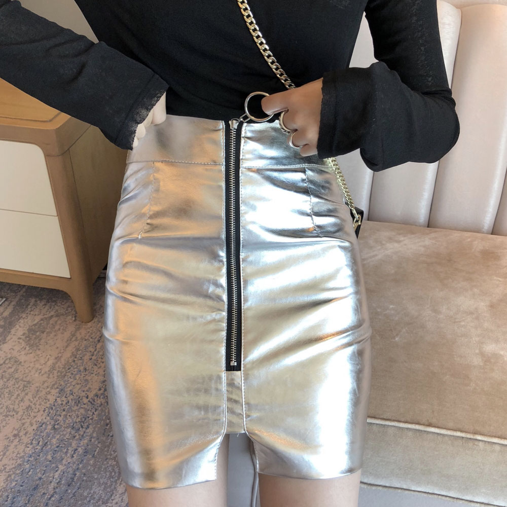 新款chic港味高腰拉鏈顯瘦反光pu皮裙半身裙性感包臀a字短裙女潮