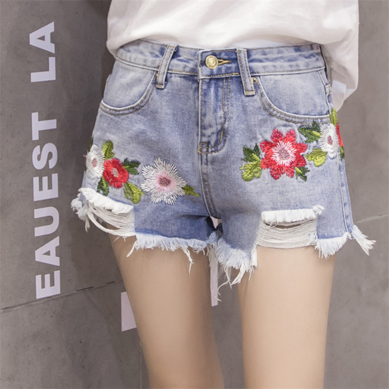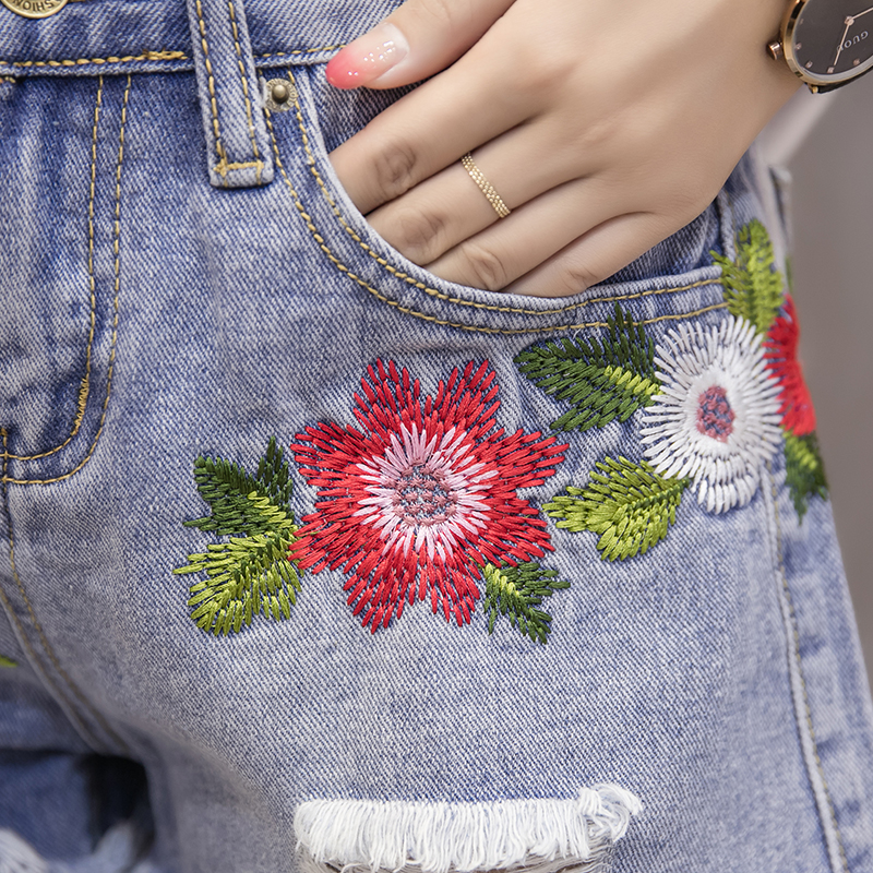 / 韓版高腰破洞牛仔短褲女刺繡不規則毛邊牛仔褲學生闊腿褲百搭熱褲