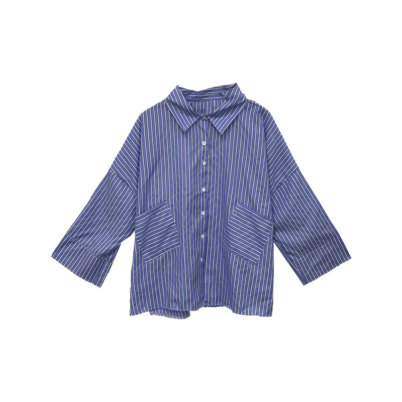 / 韓版襯衣女2018新款時尚港風翻領條紋修身顯瘦大口袋經典長袖襯衫
