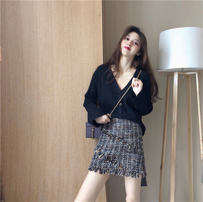 女神套裝秋裝2018新款V領喇叭袖毛衣針織開衫+粗呢高腰a字半身裙
