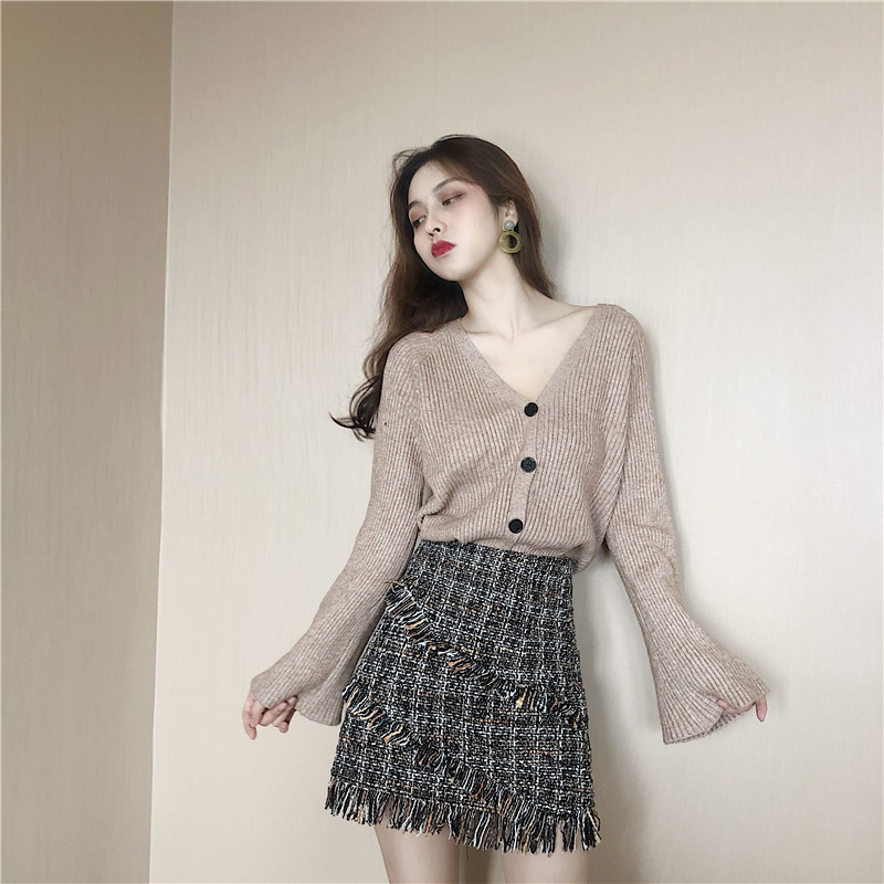 / 女神套裝秋裝2018新款V領喇叭袖毛衣針織開衫+粗呢高腰a字半身裙