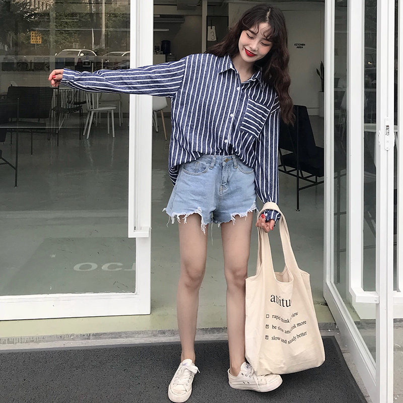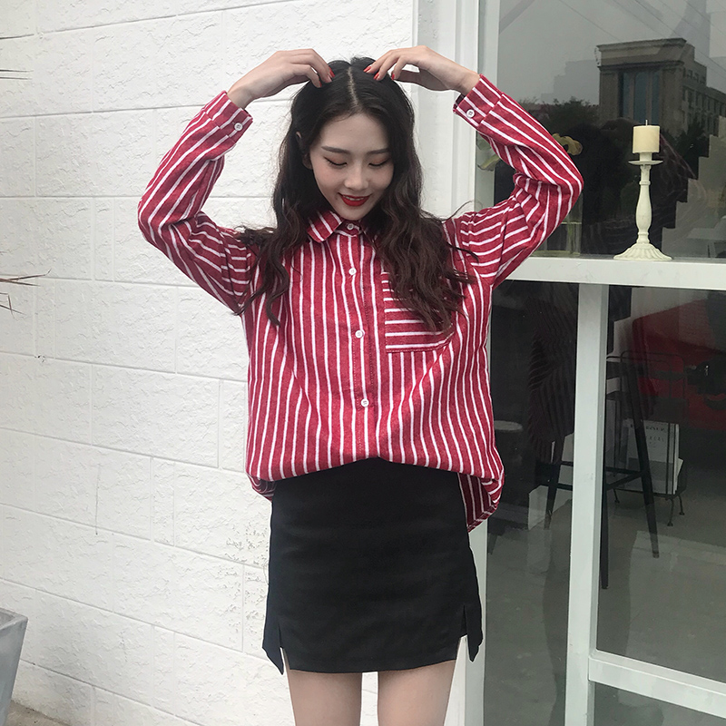 秋裝女2018新款韓版學生時尚中長條紋襯衫港味休閑寬松長袖上衣潮