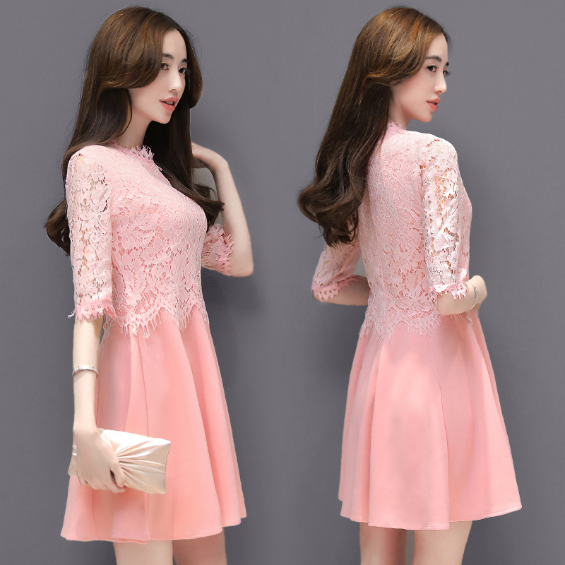 / 夏裝新款蕾絲連衣裙中裙長袖韓版時尚五分袖修身顯瘦假兩件女