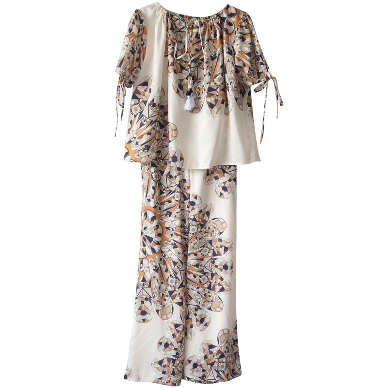 / 夏季2018新款復古寬松印花短袖上衣高腰闊腿褲小心機套裝兩件套潮