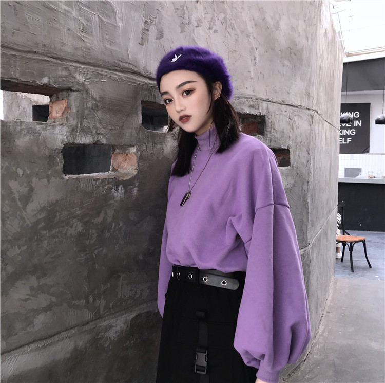 2018新款秋冬女裝韓版寬松半高領燈籠袖加絨加厚套頭衛衣上衣外套