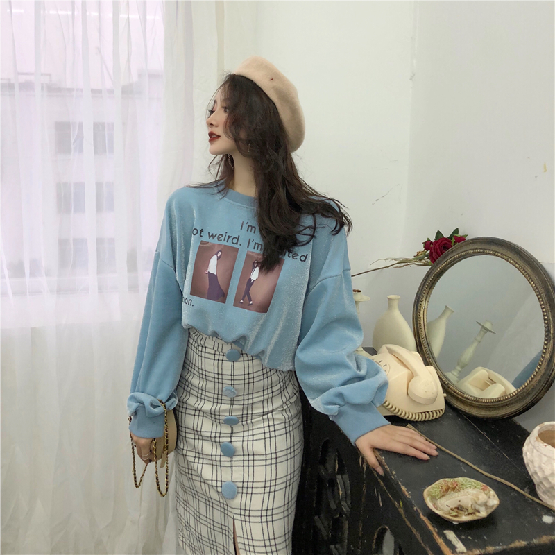 / 韓版秋裝女2018新款套裝珠光衛衣女+單排扣中長款毛呢半裙兩件套
