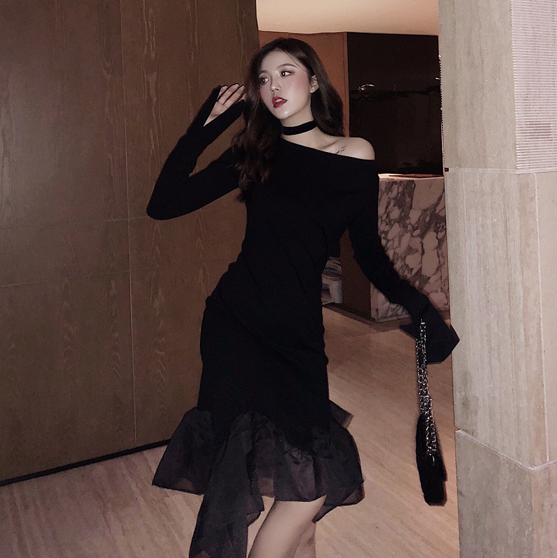 / 韓版時尚女秋裝2018新款裙子氣質拼接網紗波點長袖黑色魚尾連衣裙