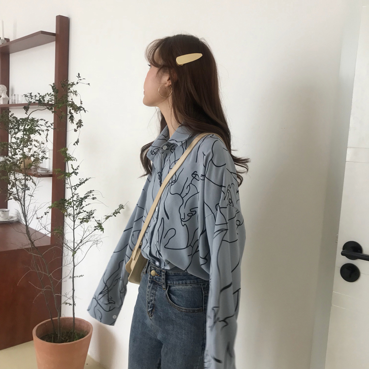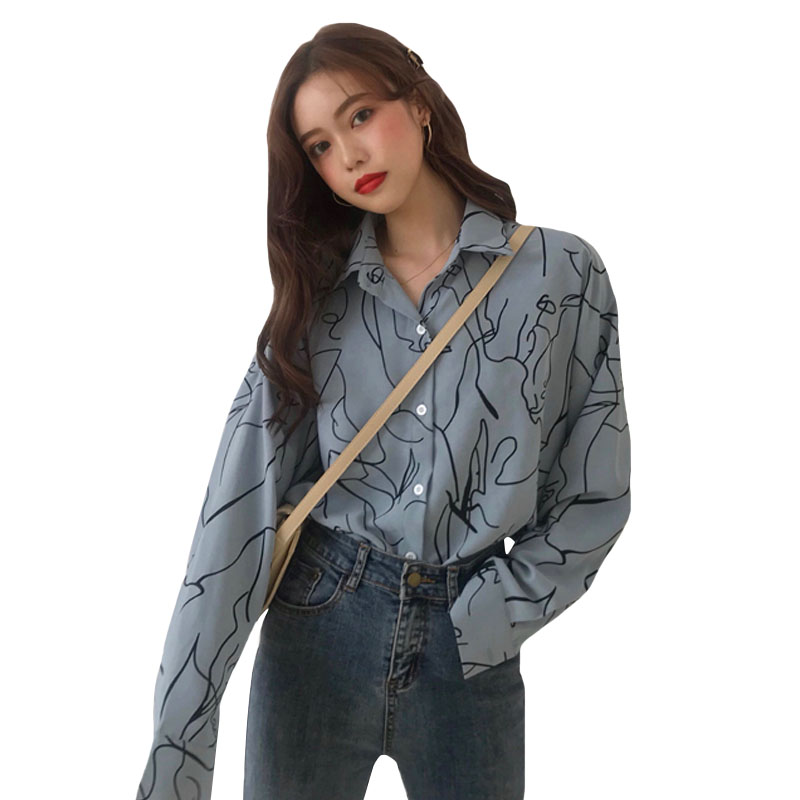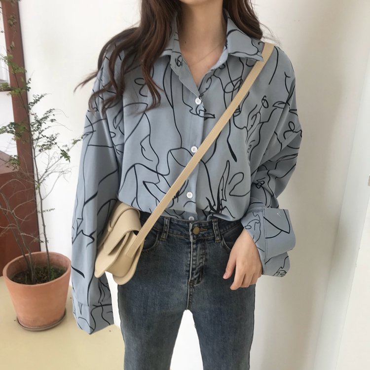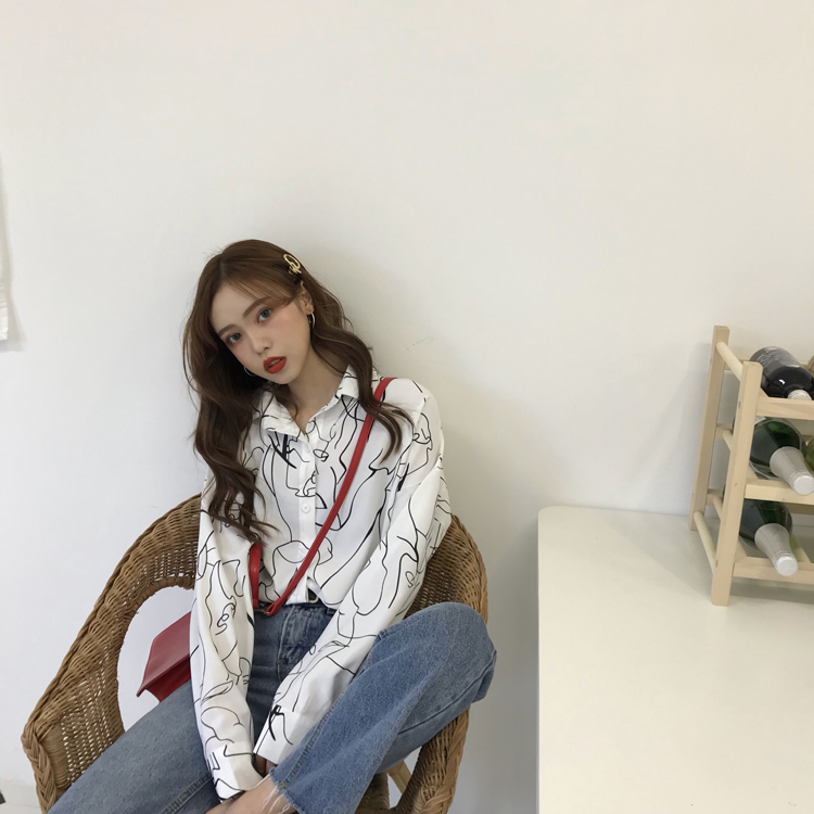 / 秋季女裝韓版慵懶風抽象卡通簡約長袖襯衫中長款寬松休閑襯衣上衣