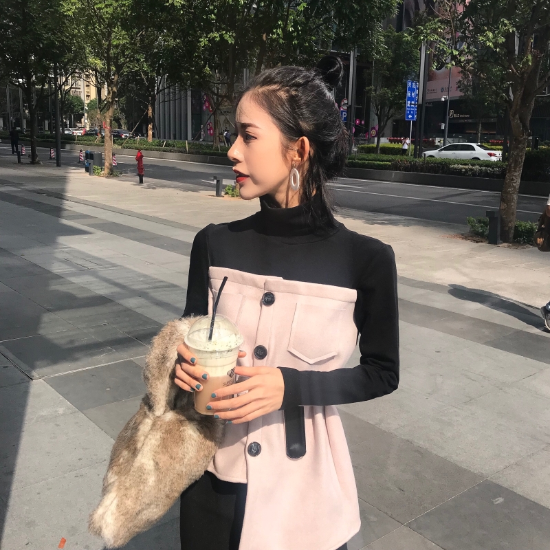 百搭高領拼接新款韓版假兩件設計感秋季chic修身不規則上衣配腰帶