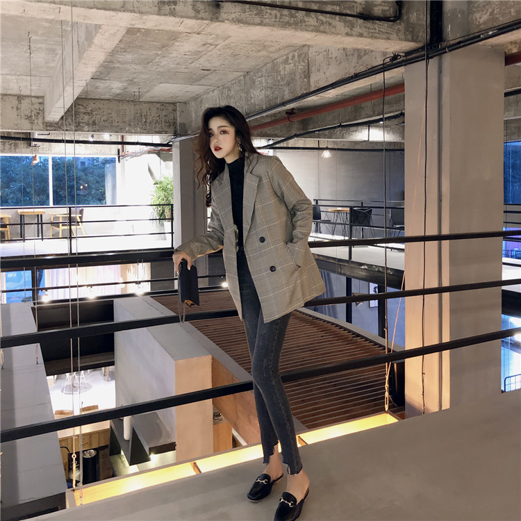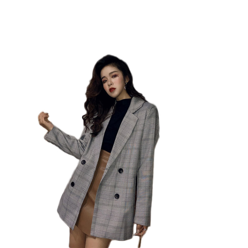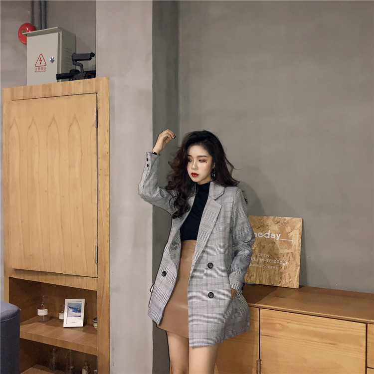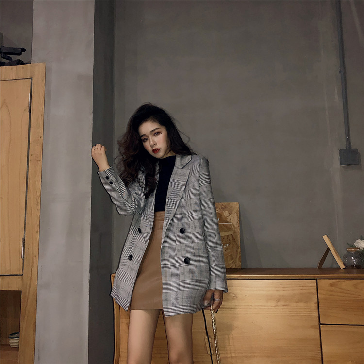 / 韓版時尚外套女春秋新款格紋西服寬松復古中長款格子小西裝上衣潮