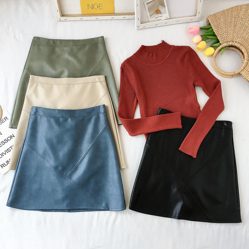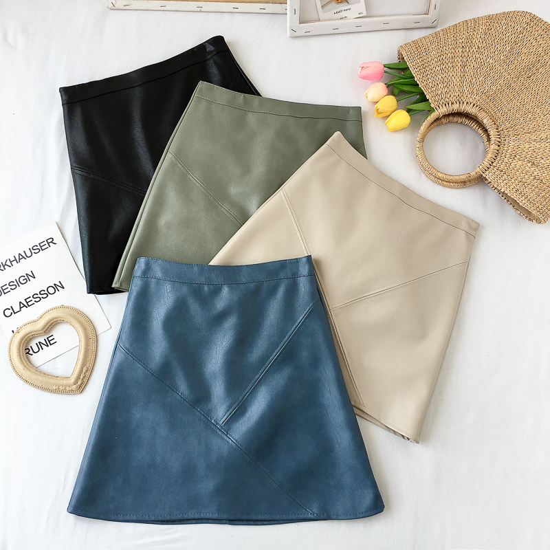 / 秋季新款韓版高腰時尚復古chic百搭拼接pu皮短裙潮半身裙A字裙女