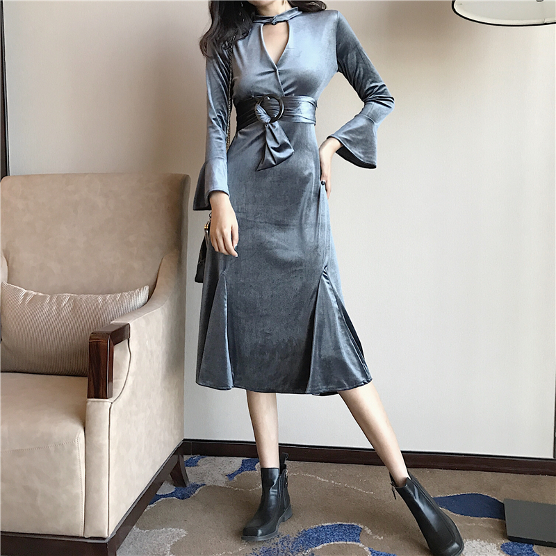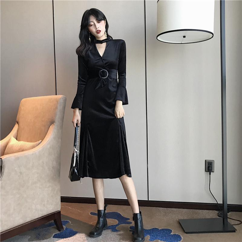 / 新款韓版chic秋季百搭顯瘦鏤空V領掛脖綁帶收腰復古絲絨連衣裙女