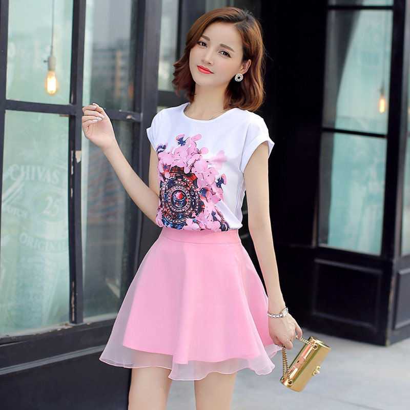 / 夏季新款名媛印花兩件套甜美小清新雪紡上衣闊腿短褲裙套裝女