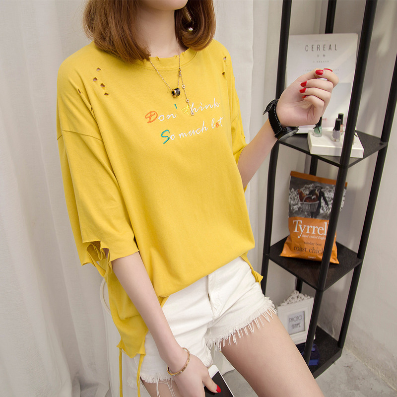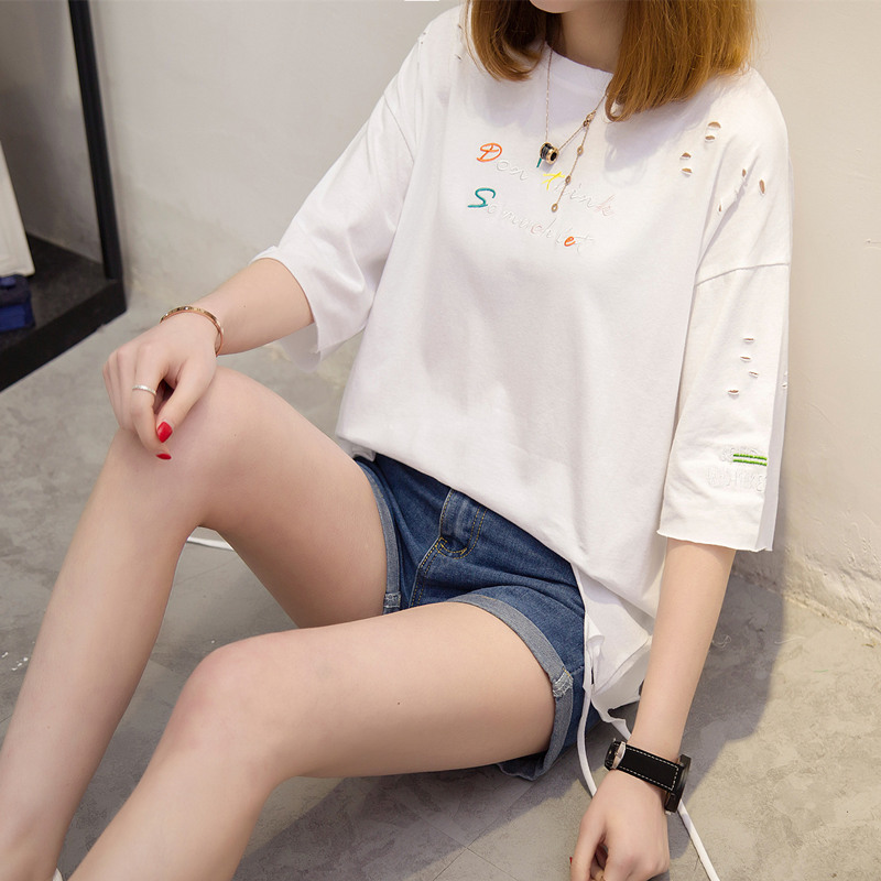 / 短袖上衣女夏新款寬松白色t恤女流蘇韓版破洞體恤衫打底百搭