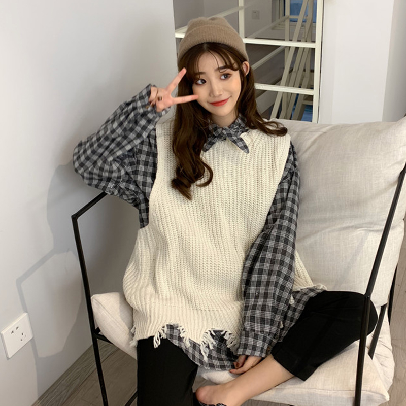 / 休閑套裝秋季女韓版破洞復古毛邊針織馬甲+中長款格子襯衫兩件套