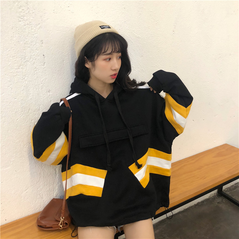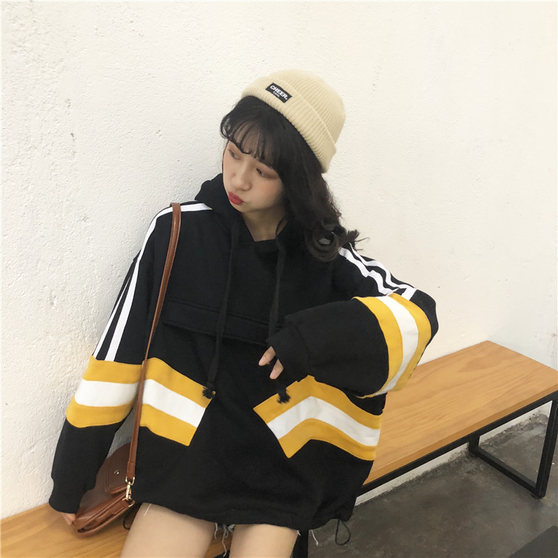 / 秋冬韓版寬松撞色拼接連帽慵懶風加絨加厚套頭超火衛衣上衣外套女