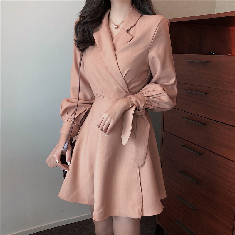 / 氣質綁帶收腰顯瘦長袖連衣裙子女秋冬裝新款黑色egg風翻領A字短裙