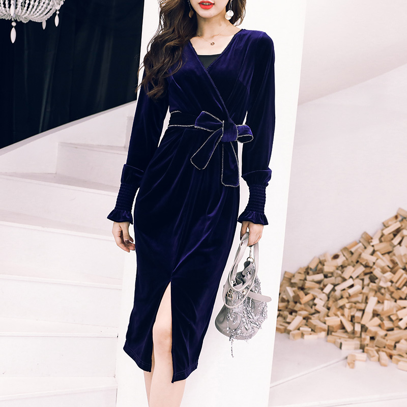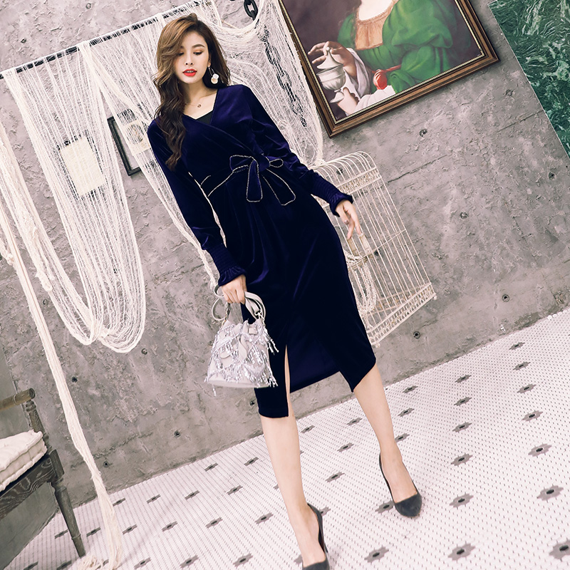 / 復古絲絨長裙氣質名媛修身裙子收腰中長款連衣裙女裝秋裝2018新款
