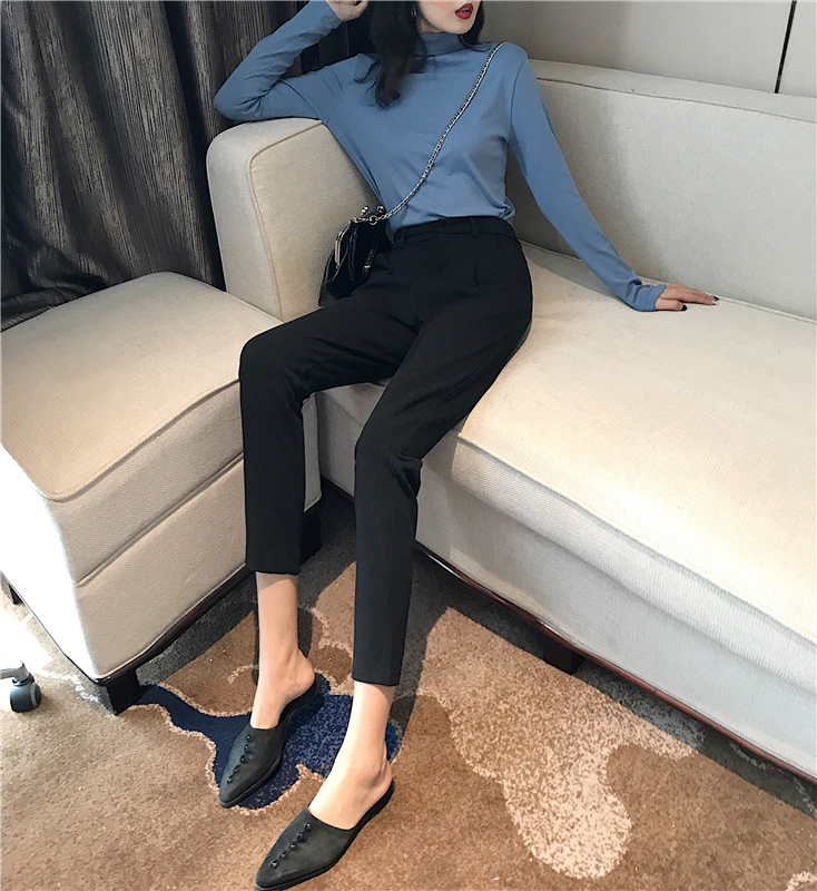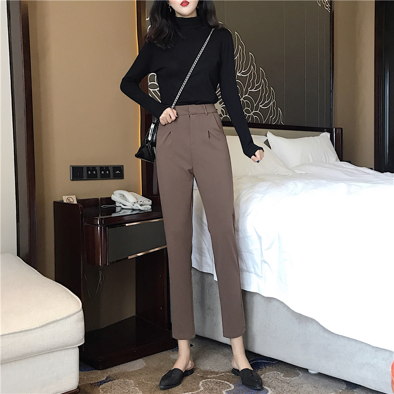 港味2018秋裝女復古百搭純色高領打底衫秋季高腰休閑褲鉛筆褲套裝