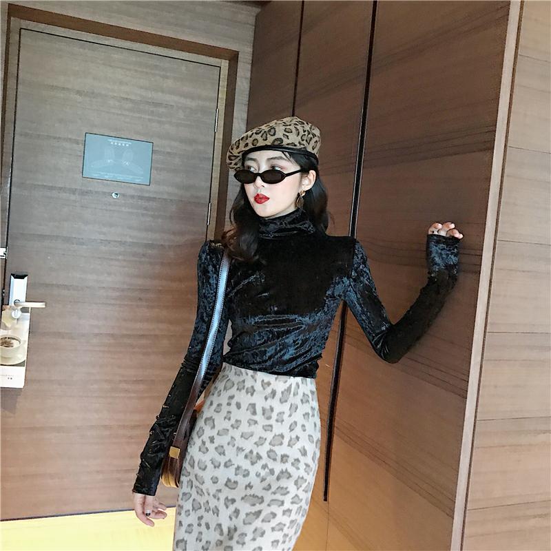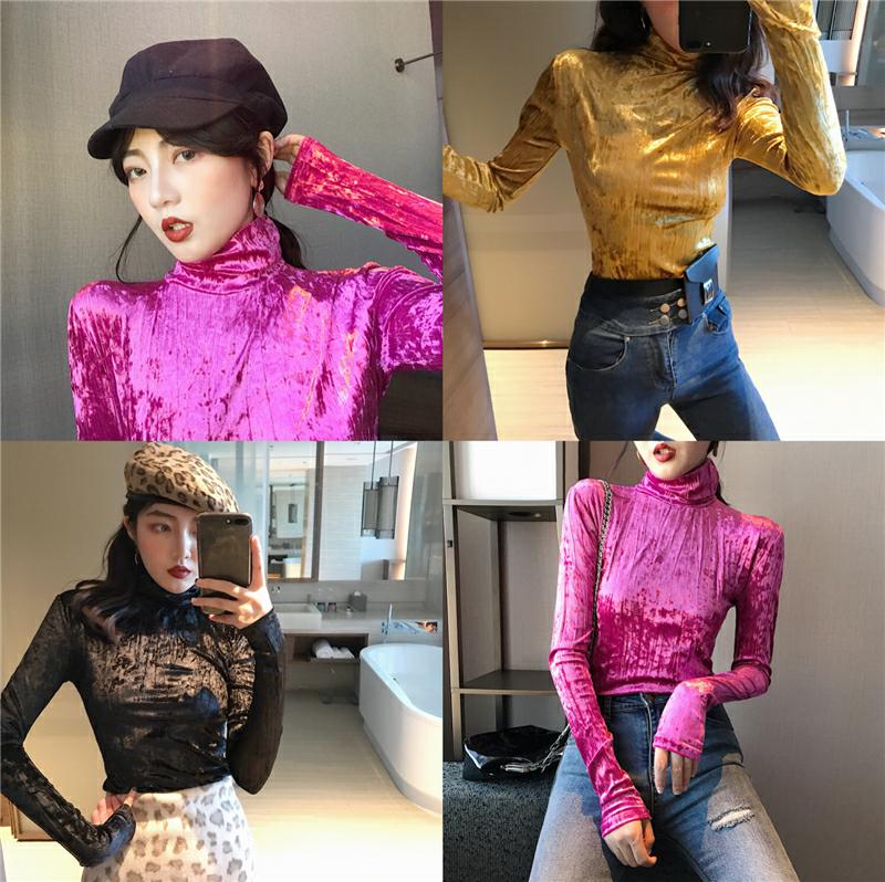 / 港味chic上衣新款韓版壓皺絲絨純色百搭修身顯瘦T恤打底衫女裝潮