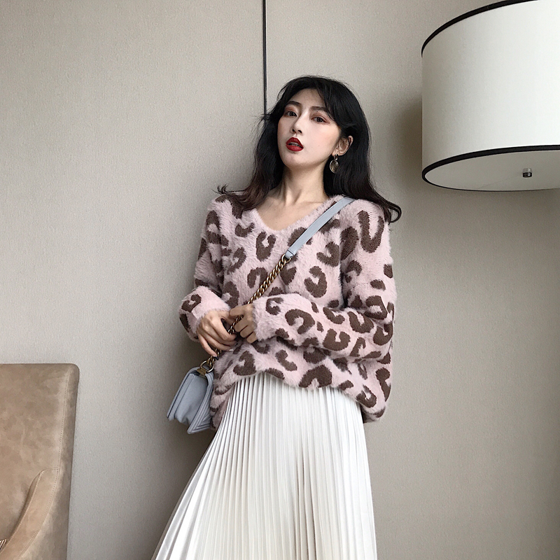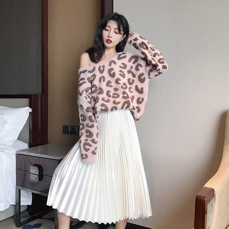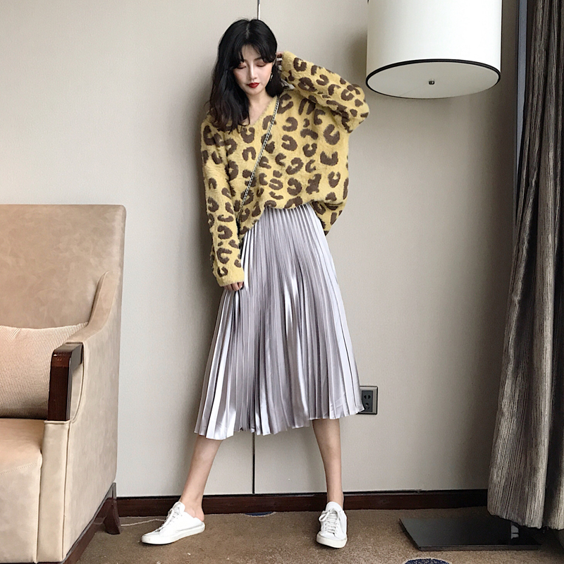 / 韓版寬松V領豹紋針織上衣高腰中長款緞面百褶裙時尚套裝兩件套女