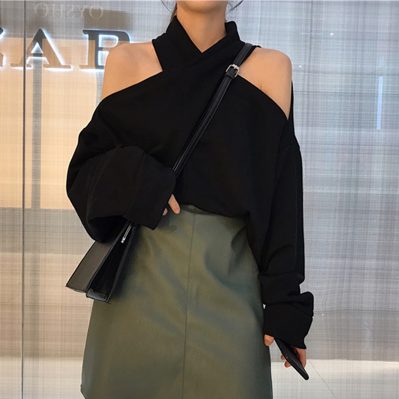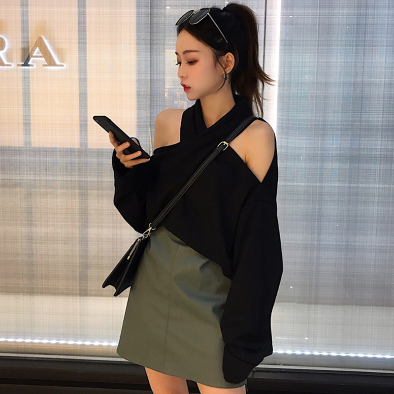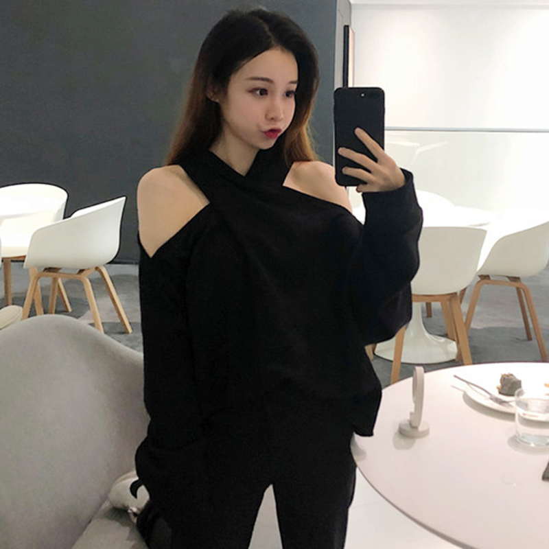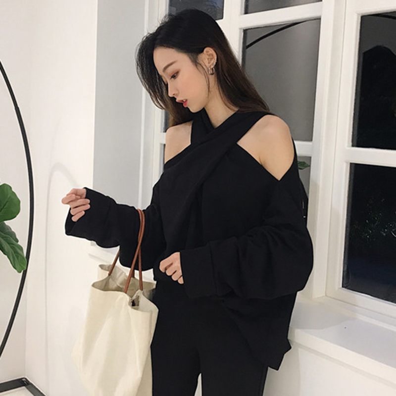/ 小心機掛脖露肩長袖上衣秋裝女2018新款學生百搭寬松黑色套頭衛衣
