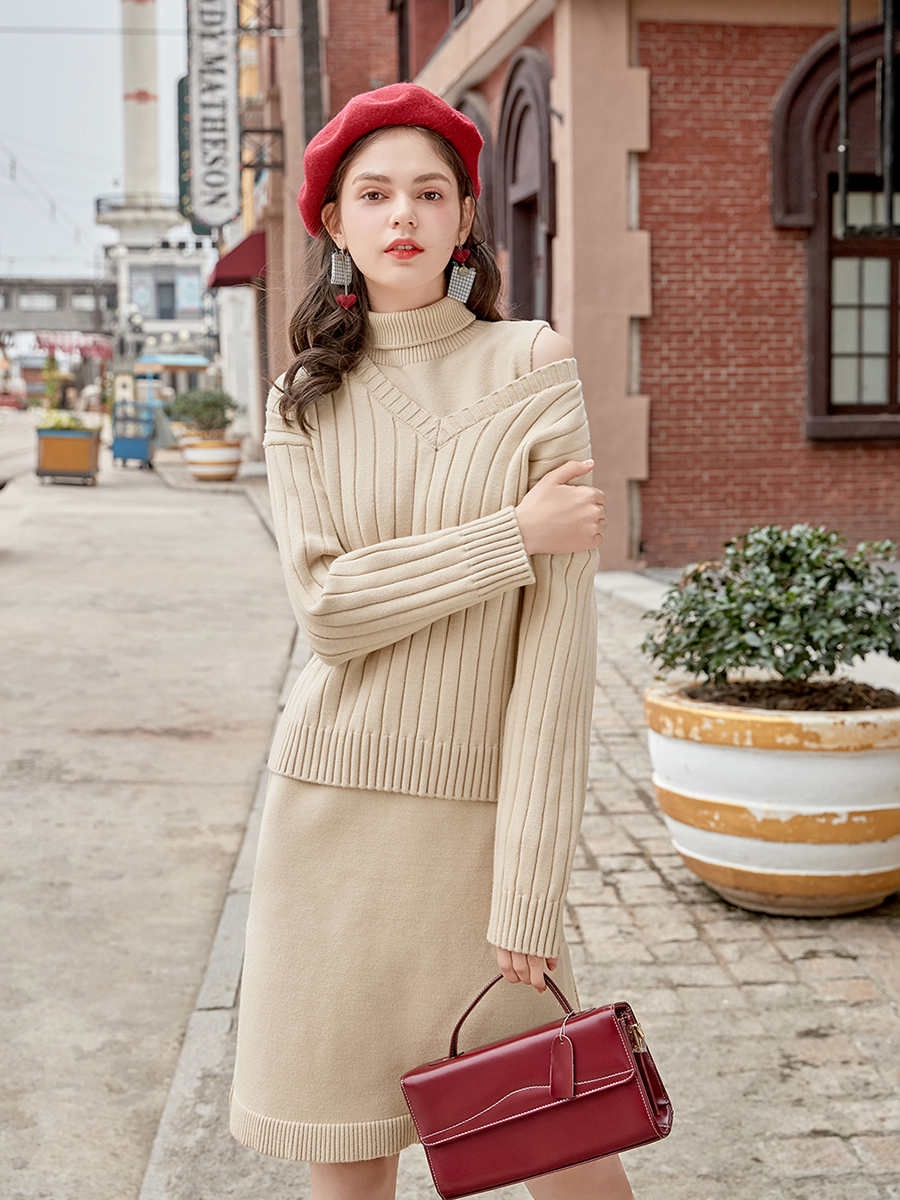 MG小象無袖高領連衣裙女冬季新款寬松v領套頭毛衣中長款針織裙子