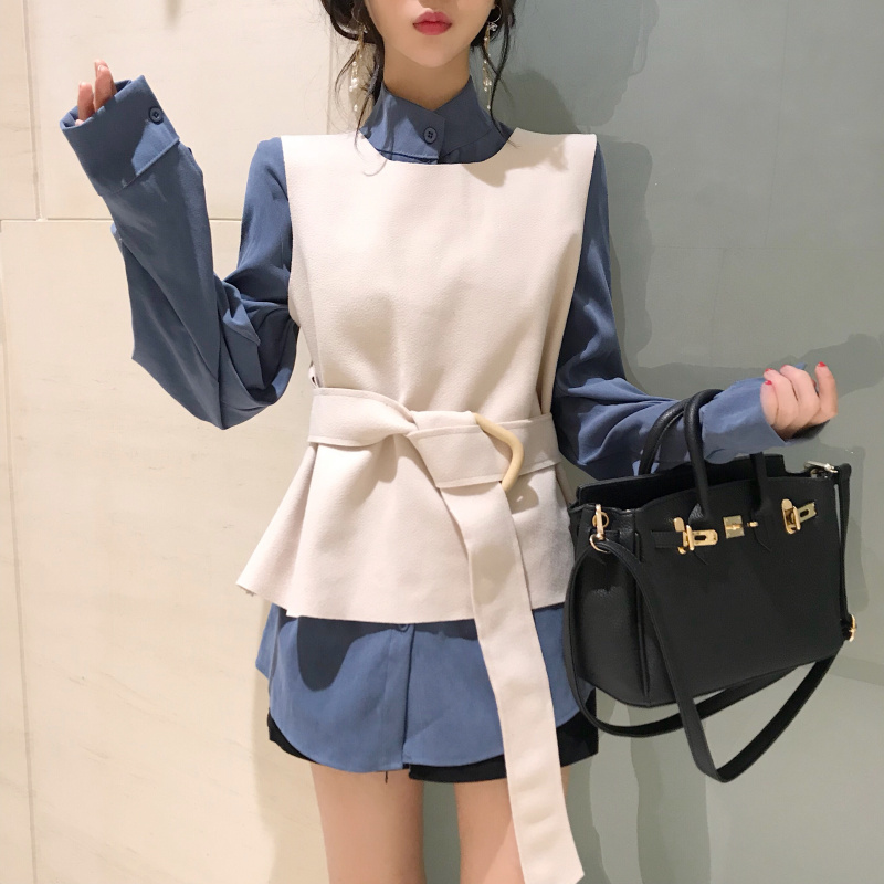 / 秋裝新款韓版時尚套裝女上衣泡泡袖襯衫女裝長袖馬甲兩件套襯衫潮