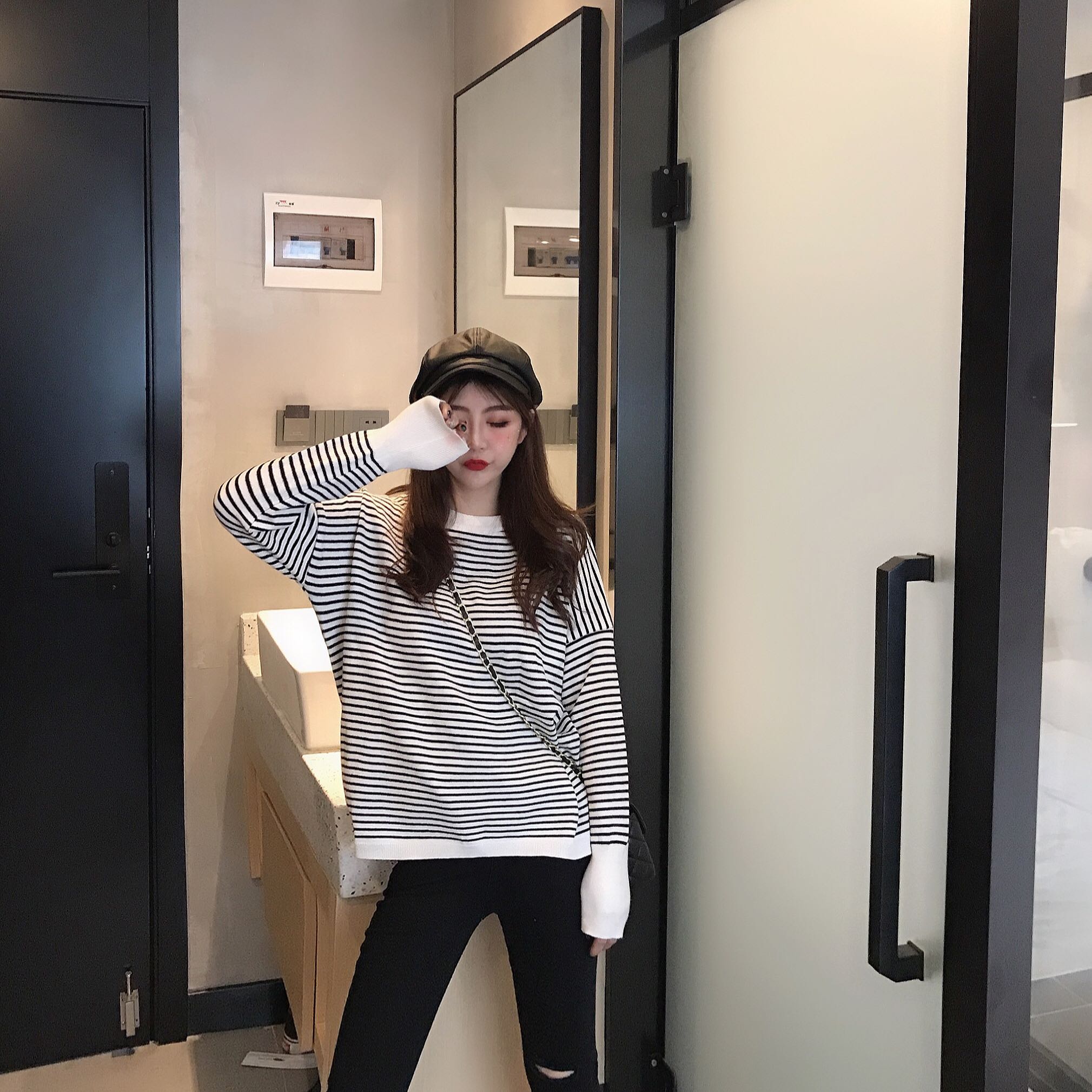 復古港味條紋包心莎柔軟寬松長袖針織上衣冬季韓版毛衣女2018新款
